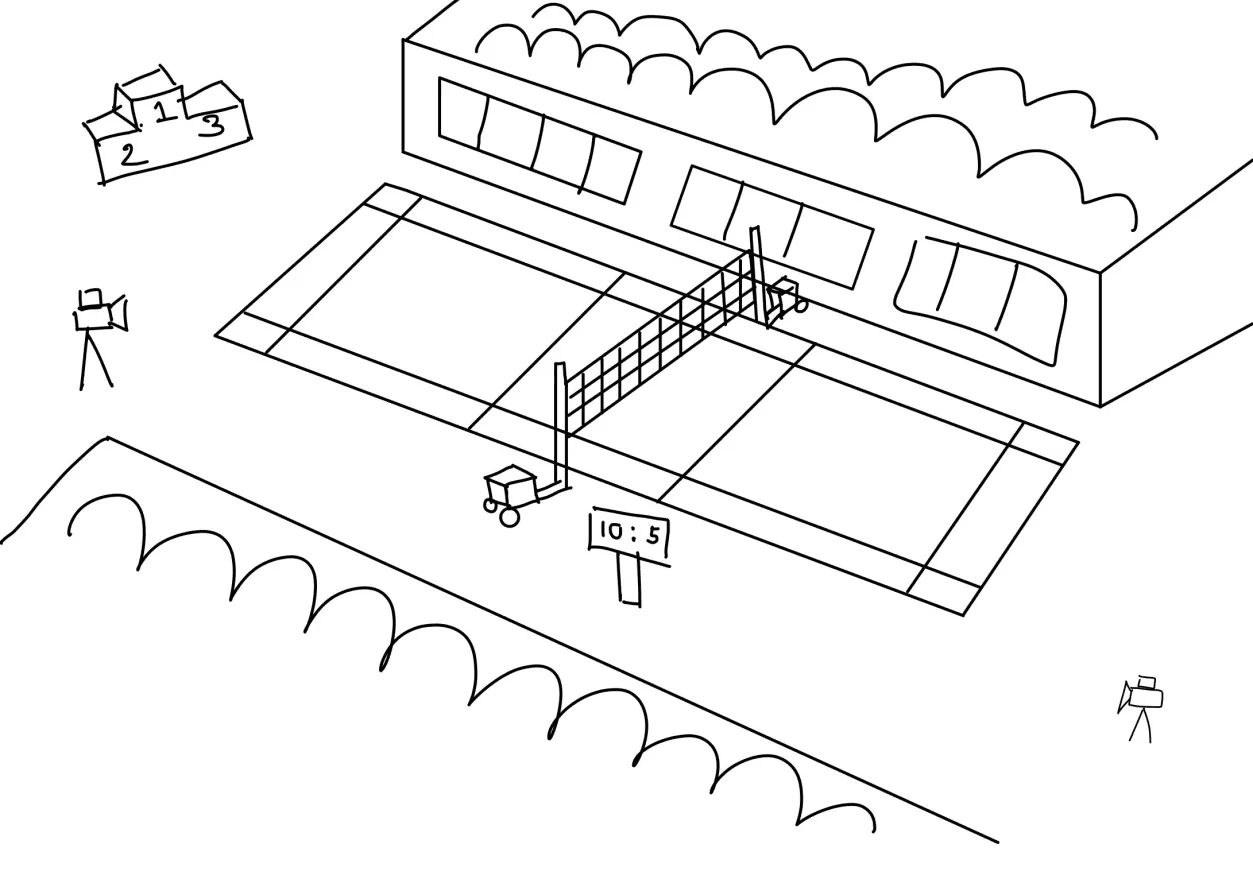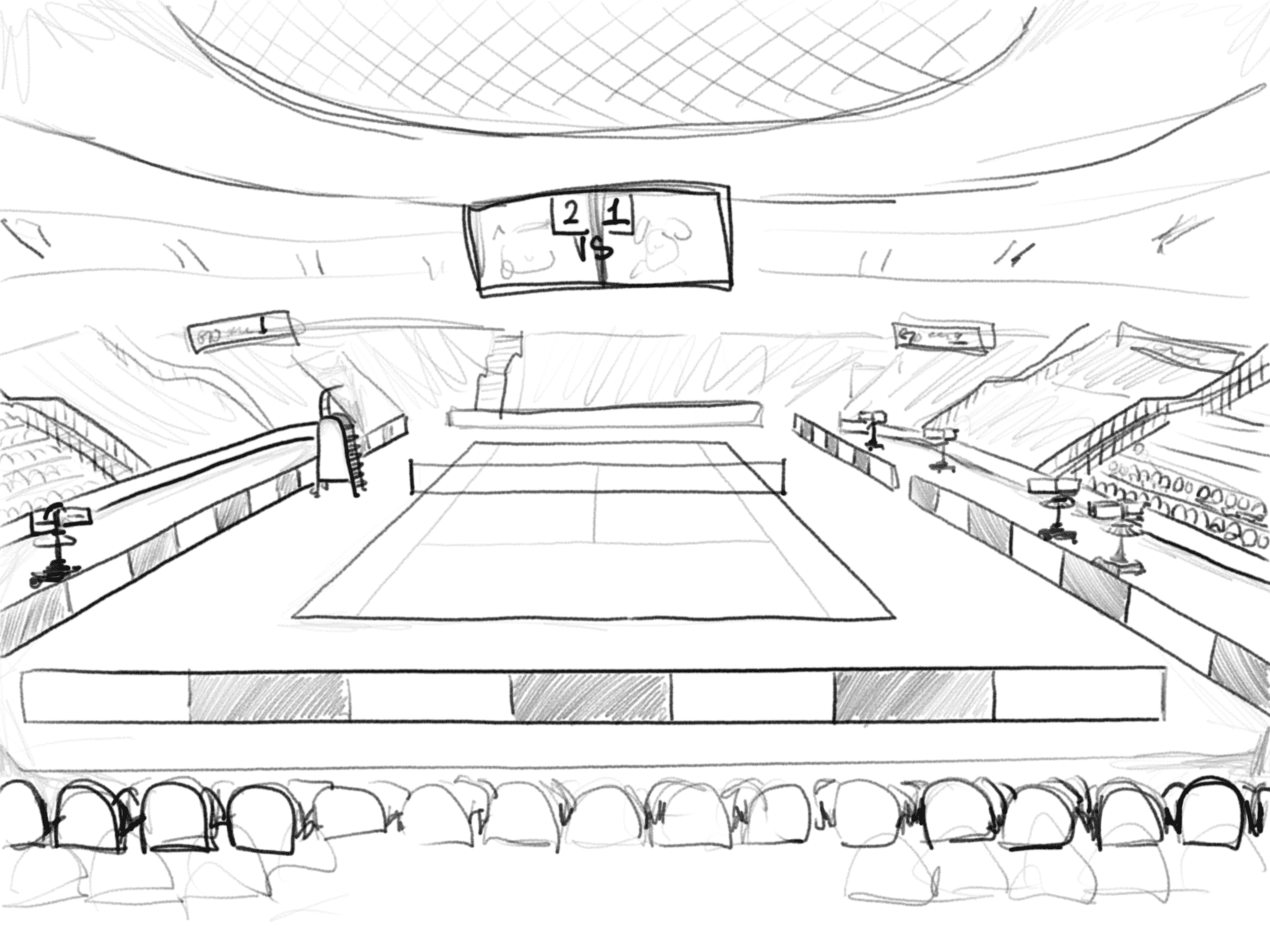 The setting of the scene is within an indoor badminton court, brightly lit with vibrant lighting that energizes the space. It is set up similarly to a professional tournament and there will be colourful banners, energetic crowds, and a digital scoreboard flashing real-time updates, all highlighting the fast-paced matches played within.
